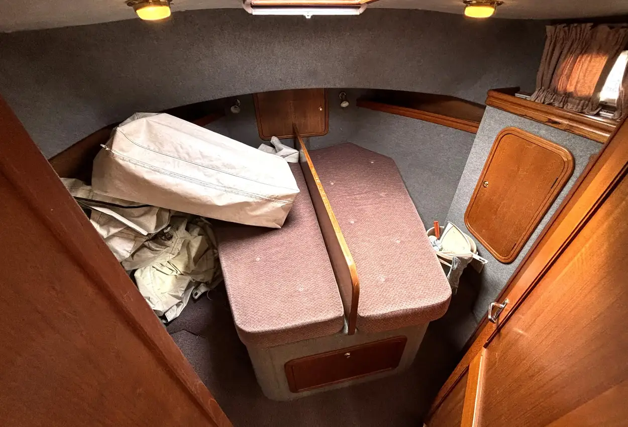 Large cabin with fixed double berth to port with drawers under, hanging lockers port and starboard plus a dressing table.